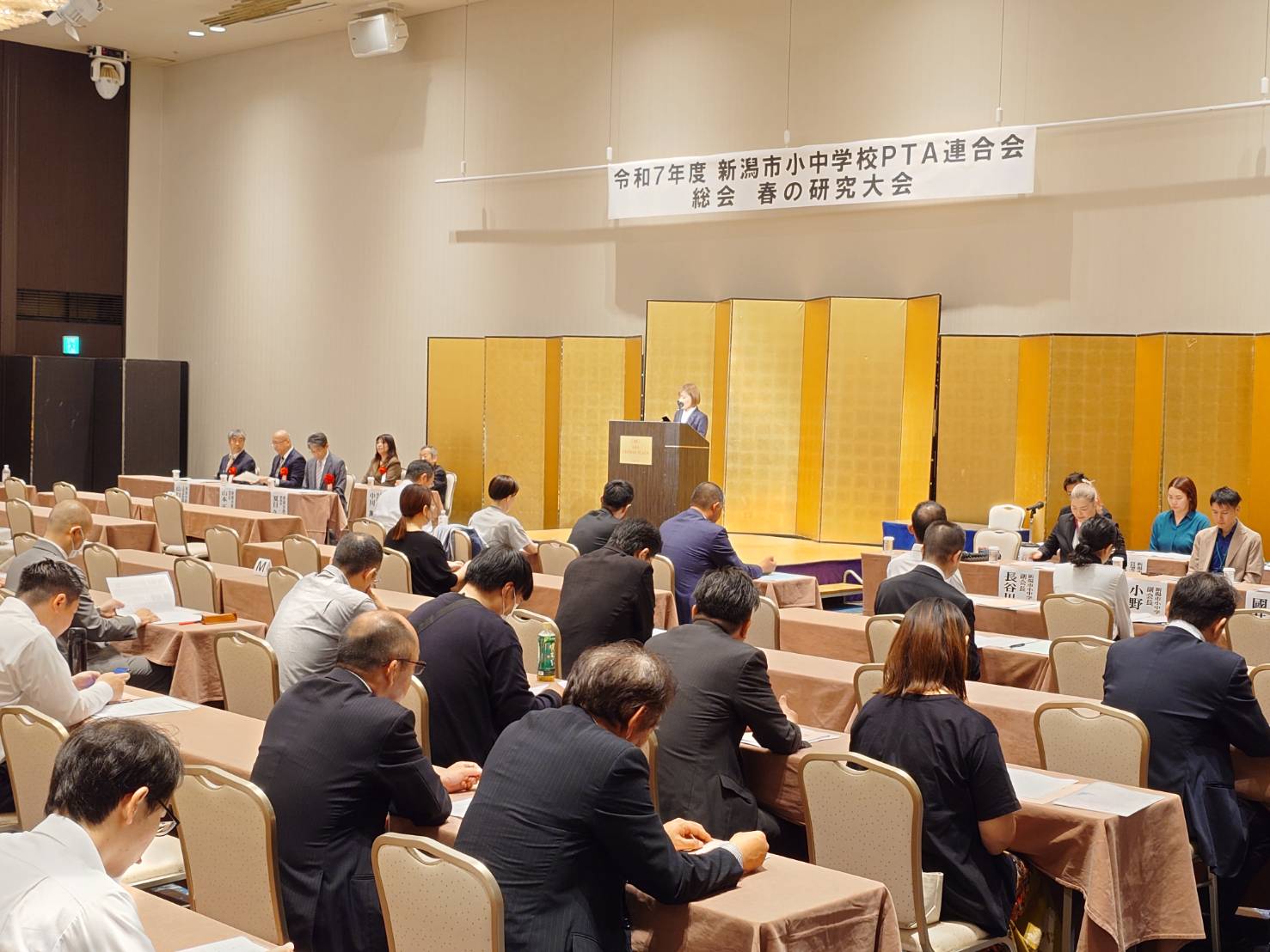 6月7日(土)、ANAクラウンプラザホテル新潟にて「令和7年度総会」を開催しました。市内小中学校PTA会長、学校長代議員78名により、令和6年度事業・決算報告、令和7年度役員選出・事業計画・予算案が審議され、いずれも可決されました。PTAは19世紀米国に起源し、GHQが日本に伝えました。戦後80年、PTAの変革は肝要ですが、子どもたちにとってなくてはならない組織として、「縮小ではなく進化を」と、歴史に触れつつ、力強いメッセージが佐久間会長より述べられました。市P連は多岐に渡る課題を取り上げ、話し合う場づくりに努めていますが、会長から「教育の原点である家庭教育の充実を図ることも市P連の大切な任務」との表明もありました。